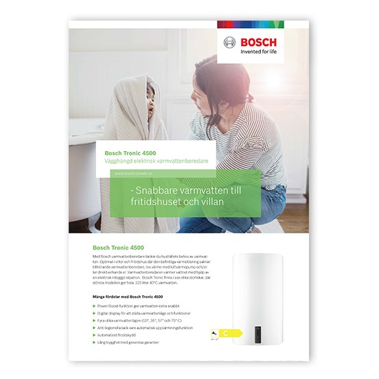 Bosch Tronic 4500 är varmvattenberedare som snabbt och energieffektivt ger stora mängder varmvatten när du behöver det.